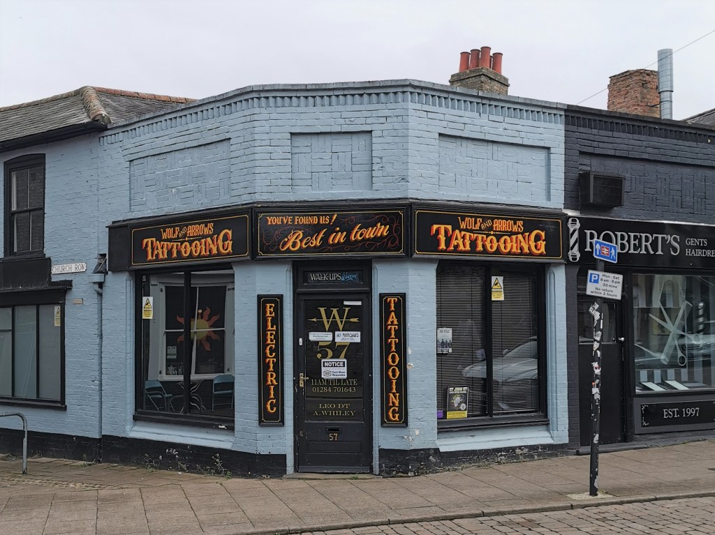 The station at Bury St Edmunds (above) is out of the town centre, which is an uphill walk away – in the otherwise flat-as-a-pancake Fens settlements were built where they wouldn’t be flooded. Our first impression wasn’t great – the area round the station isn’t inviting, comprising some bog standard new flats, a busy road junction which is impossible to cross without kindly drivers stopping. Also, the nearest pub – the Beerhouse – didn’t open until the evening (note 1). We pressed on to the town centre, past the best tattoo shop in town (pictured -this may or may not be true – we saw several during our visit). Don’t let this put you off – Bury is a much better place than the first impression.
