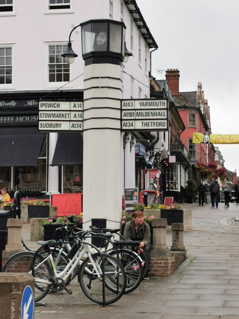 It is a historic town and was particularly important during the medieval period. The Norman grid street plan dates from the 11th century and many of the town centre buildings date back several centuries. There are extensive remains of the Abbey, destroyed in the sixteenth century, including more modern houses built into the abbey ruins (pictured). The cathedral of St Edmundsbury was promoted from a parish church early in the twentieth century and building work including a new tower has continued until recently. The industrial revolution passed this area by and today the main industries are the Greene King brewery and a sugar processing factory. The town has significantly expanded since the 1950s as an overspill area for London, though the tourist will see little sign of the newer estates. Bury is also home to the world’s first illuminated street sign (phew!), constructed in 1935 and known as the Pillar of Salt (pictured).
