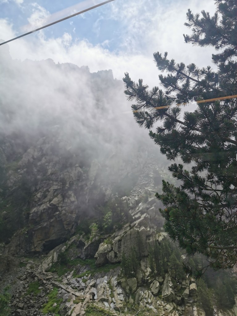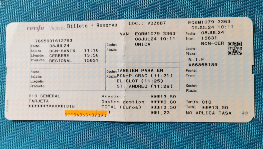 At 0830 on a Sunday morning (the next train wasn’t until 1130) Ted and I set off towards the Pyrenees. Though branded a suburban train – the line is Rodalies R3 – the destination was La Tour de Carol, just over the French border. We were travelling to Ribes de Freser, almost three hours away. We expected a peaceful journey but at the first, city centre, station, Pl. Catalunya, the train became packed with jolly walkers off for a day in the mountains. To be fair it was ideal walking weather – sunny spells and not uncomfortably hot – the people were friendly and chatty but we spent the journey squashed into our seat.