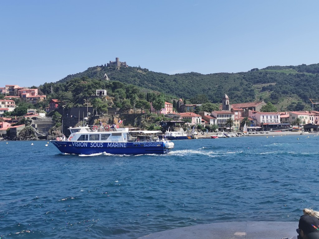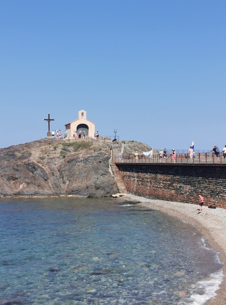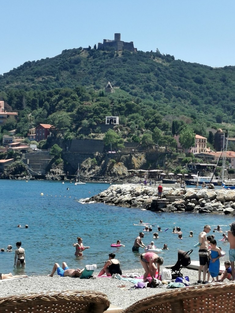 We wandered along the lanes of the old village down to the harbour and the main beach. The harbour was bustling with pleasure boats and the beach was busy with holidaymakers enjoying the weather. Behind the beach and alongside what had been a river through the village (now bizarrely culverted and converted into a car park) are rows of bars and restaurants. At one end of the bay is the church of Notre Dame des Anges, which was formerly a lighthouse – these days it looks like a willy. To one side of town is the Chateau Royal fort and on the other is Fort Miradou. Today they are partly used for marine commando training,presumably in case Spain decides to retake French Catalonia.