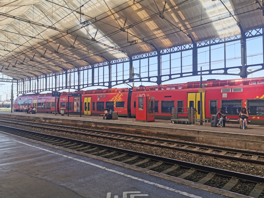 Our next stop was Nimes. To get there we took two regional TER trains, with a change at Narbonne. The train called at Perpignan then entered the area of coastal lagoons or étangs. The line often follows a narrow stretch of land between the sea and the lagoons – it can become quite confusing trying to work out which side is the sea. At Narbonne we had a 40 minute wait for the connection so we headed for the main hall – full of people because there were some long delays on TGV trains.