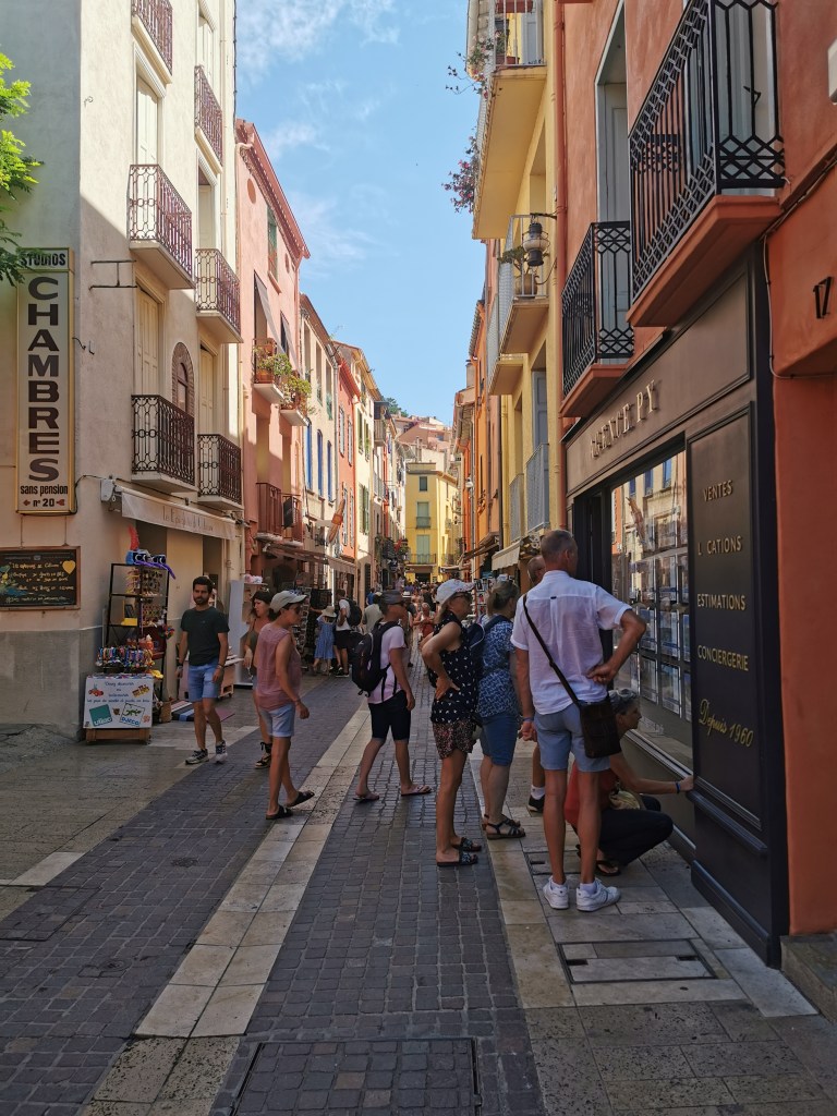 From Cerbére it was a short three-station hop to our destination Collioure (pictured). This area of French Catalonia (Catalogne Francaise) looked attractive when I passed through previously – Ken had visited the region and confirmed this – so we had planned to stop there for a couple of days. Today the series of villages are small tourist resorts built around coves and harbours. I had selected Collioure purely because the station was closest to the town centre. It proved to be an excellent choice for a restful stay to break our journey. We toddled into town, checked into our hotel and set out to explore.