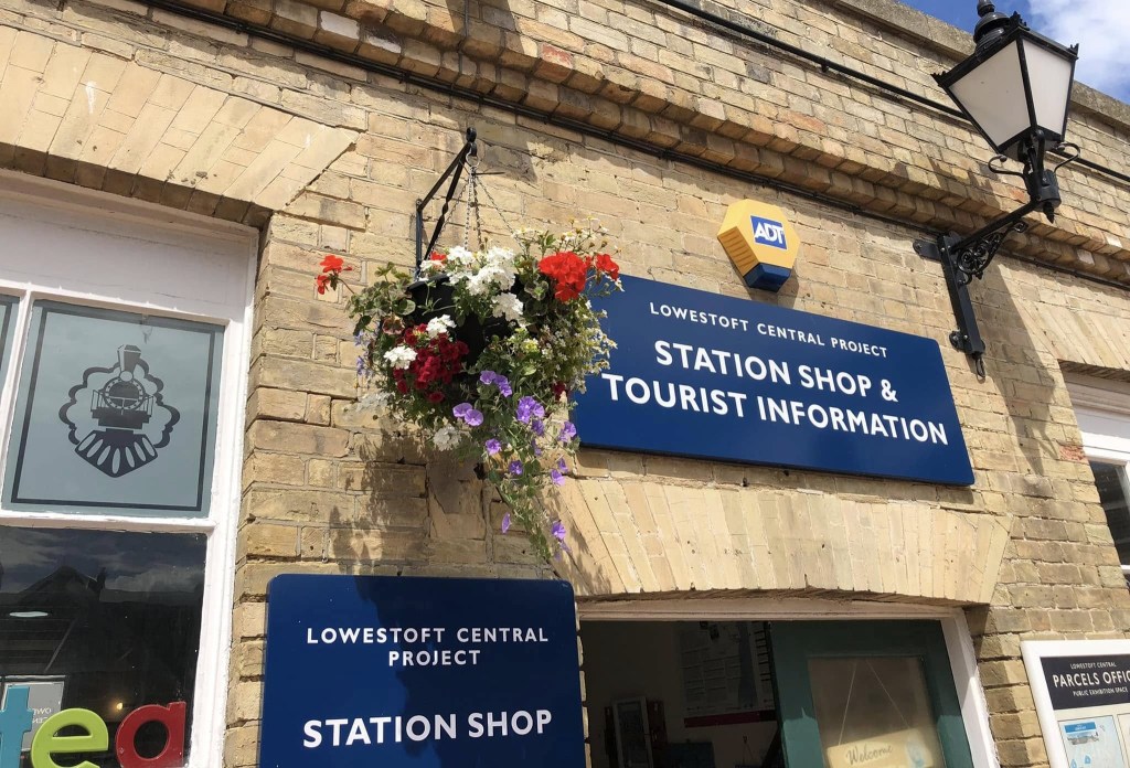 We crossed the level crossing to the eastbound platform and caught a train to Lowestoft. As far as Reedham this was a stretch we had travelled yesterday. After there we journeyed through more of the Norfolk Broads National Park then alongside busy Lowestoft harbour and into the station. On the station concourse is a shop where the Community Rail Partnership have a shop cum tourism information centre (pictured). There are lots of transport books for sale as well as a selection of gifts and I was able to purchase our souvenir tat for this trip.