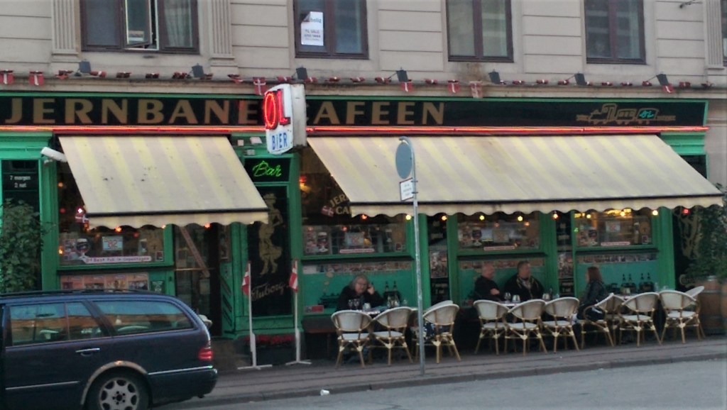Back on the metro into the city centre at Kongens Nytorv square, and a short walk to get some pictures of Nyhavn, now the centre of tourist Copenhagen. Back in the square itself is a little kiosk, with deckchairs outside, which turns out to be a bar, so a beer break is called for. Then a visit to a souvenir shop to buy some tat for my tat shelf – a Little Mermaid snow scene and a fridge magnet of Nyborg. Back to the Central Station, collect the rucky and Ted, cross the road from the side entrance for our final beer in Copenhagen – in the same place as the first one six days ago – Jernbanecafeen.