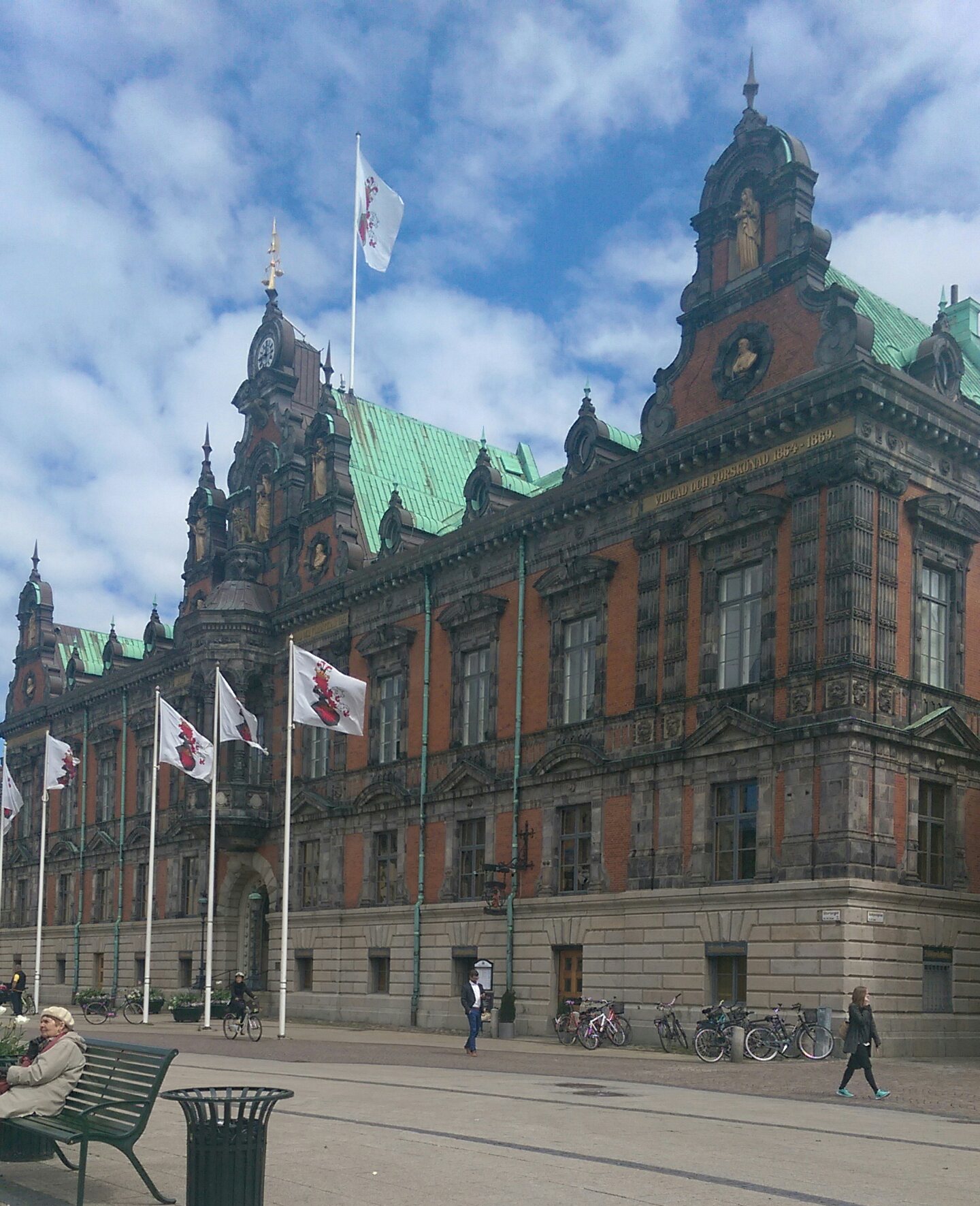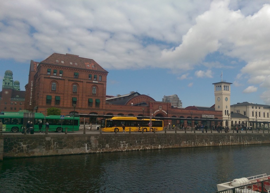 Then on to the Øresundståg train, across the Øresund Bridge (of The Bridge fame) to Sweden (see Railway Buffery 1, below). The railway deck is beneath the road deck, so the views are limited but it’s impressive anyway. Just over half an hour after leaving Copenhagen I’m in Malmö, via the new City Tunnel (built to make Malmö Central a through station) to the low level section of the Central Station. It’s only a few minutes walk to the main square (Stortorget) with the Rådhuset (town hall) occupying one side. Just off to one side is Lilla Torg, or little square, full of cafes and restaurants with outside tables. Lunchtime cheap set menus and buffets are popular and most places are busy with diners, but Ted and I settle for a beer at Victor’s. All of the outside terraces have gas heaters for the evenings and blankets to keep you warm during the day if necessary. Most people are drinking water, which is provided free – it keeps the price down to that for the set meal – but makes us feel disreputable for having a beer at noon.