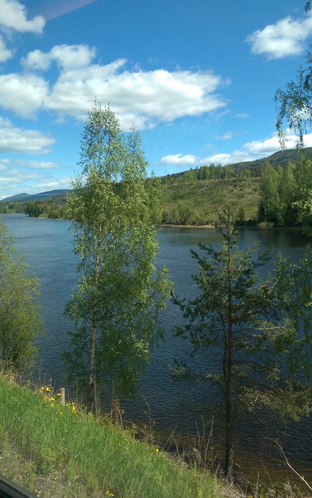 It’s a tremendous journey, one of the most scenic railway journeys in Europe, and it gets better, the further we go. We head south through the suburbs as far as Drammen, where we cross the head of the Drammen fjord by a long bridge. Then we turn west through a series of small towns and then north through forested countryside along the side of Tynfjorden lake with groups of summer houses by the water, to Honefoss. Already there is the occasional sight of snow (it is late May) on mountains in the distance.