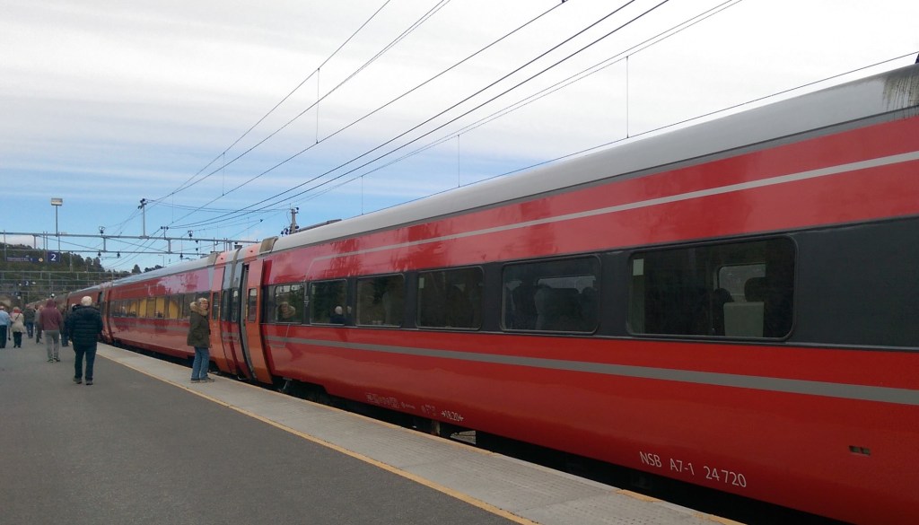From Göteborg to Oslo there are only a maximum of 4 trains a day, taking just under 4 hours to cover the 350 kms. The trains are operated by NSB, the Norwegian State Railways. I managed to get cheap advance minipris ticket for this stretch for about a third of the full price. The train is relatively quiet despite it being a Friday afternoon, and it doesn’t feel like a main line between two major cities. We later discover that the train is slower and full price fares are more expensive than the coach service, but the route is much more scenic than a motorway.
