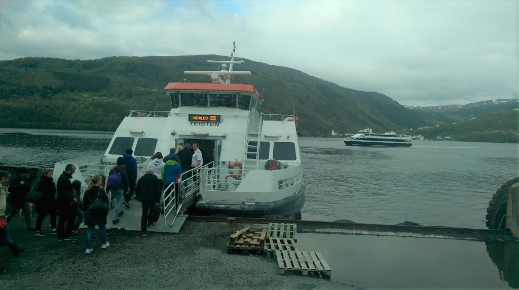 The line to Bergen is still blocked and Voss is the last place the locomotive can run round the train to return to Oslo, so the 400 passengers are transferred to a small suburban train, which is packed. After about half an hour we reach Stanghelle, the last station before the landslide, and from there the only way onwards is by boat. We scramble down to the pier where there are two ferry boats waiting for us, and we are treated to a cruise along the fjord. We disembark at Garnes where a fleet of coaches take us a couple of miles to Arna. The final stage is on another local train for the brief journey into Bergen. Initially this seemed a bit unnecessary but it makes sense – the railway line tunnels straight through the mountains whereas the road follows the shore of the fjord and takes a much longer route. Despite the diversion, which in this case made the journey more interesting, we are only an hour late into Bergen.