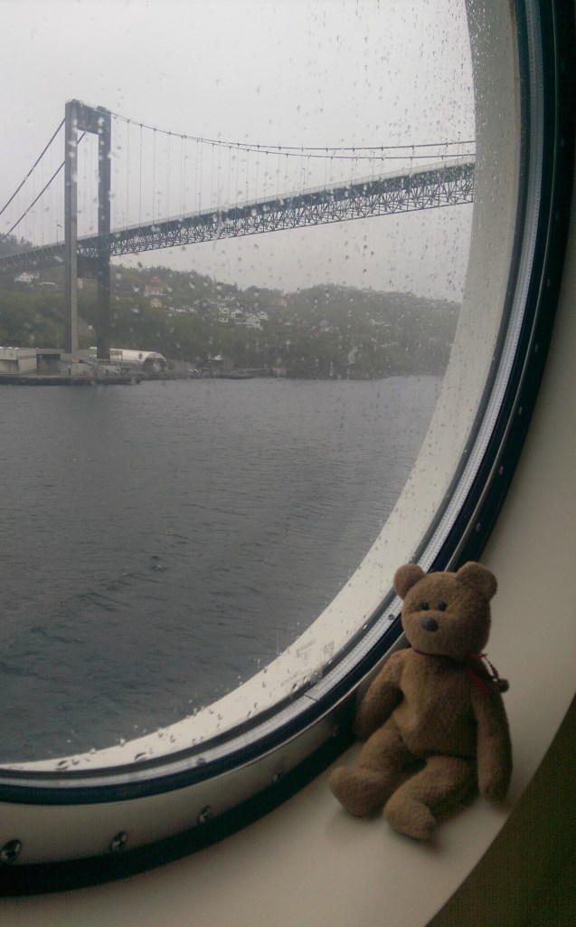 From Bergen to Stavanger we spend most of the time threading through the offshore islands passing under bridges and by local ferries. I take some photos of Ted at the porthole looking at the drizzle and explore the ship and even go out on deck for a bit. The beer on board is standard Carlsberg but it’s at duty free prices and only about £4.50 for 50cl. It’s rubbish, but it’s cheap rubbish, so I have a couple of them then back to the cabin to read, which becomes a siesta. As we pass Haugesund, the weather starts to clear and there is the odd patch of blue sky, so we spend the time looking at the view.