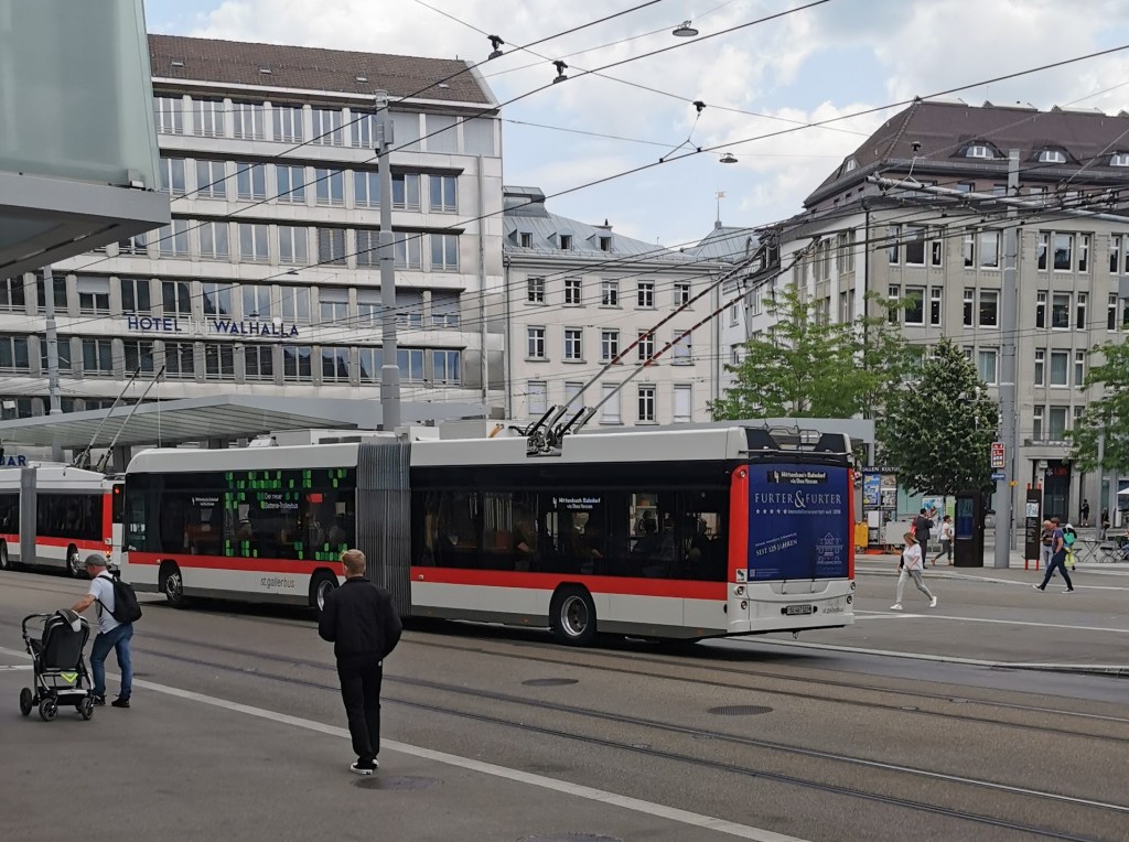 We met one of Ted’s relatives in his own square, Bärenplatz, then found the Brauwerk brewpub. The many patrons drinking coffee (on a Friday lunchtime!) were missing some excellent beer. For the transport nerds St Gallen was also trolleybus central with some very flash new trolleybuses on the routes radiating from the Bahnhof Platz and Appenzellerbahn tram-trains passing along the main streets.