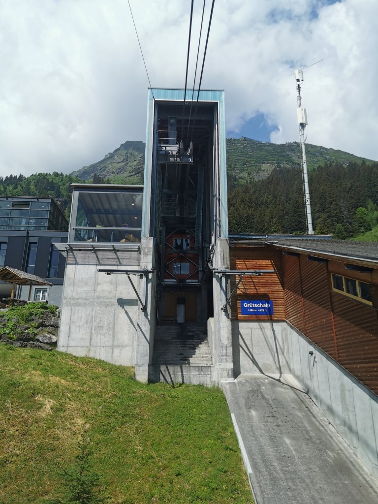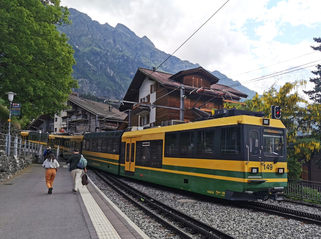 The plan was to revisit a few of the local railways and travel on the Eiger Express – a new cable car constructed since my last visit to the area. Ted and I headed back down to Lauterbrunnen to start the day. We had to reverse the planned route of the journey due to the temporary closure of the Lauterbrunnen – Interlaken railway. Our first stop was Wengen, with views along the way across the valley to Mürren. There we sorted out a ticket for the next section and took the opportunity to have an early beer in the Crystal Bar pub.