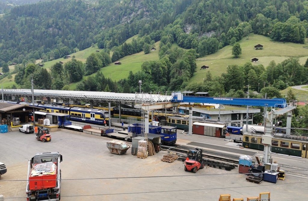 Views of the cable car and railcar between Lauterbrunnen and Murren. They show how goods are transported to the village and the former line of the funicular, which was replaced by the cable car. New railcars have been delivered and the final day of operation of the old railcars was 20 October 2024.
