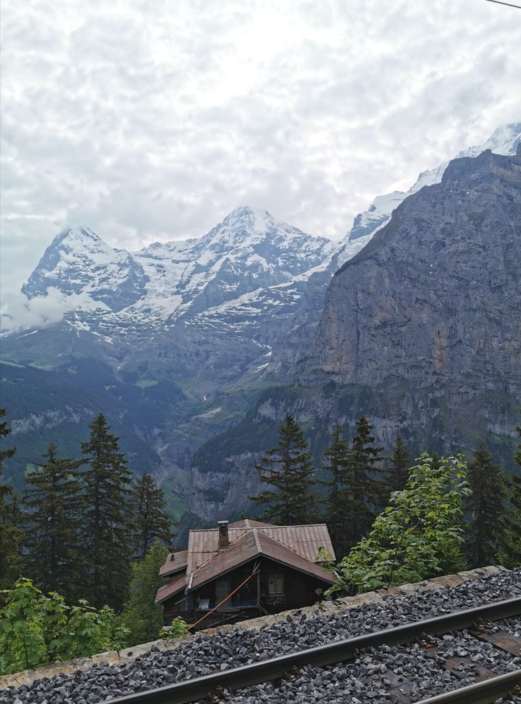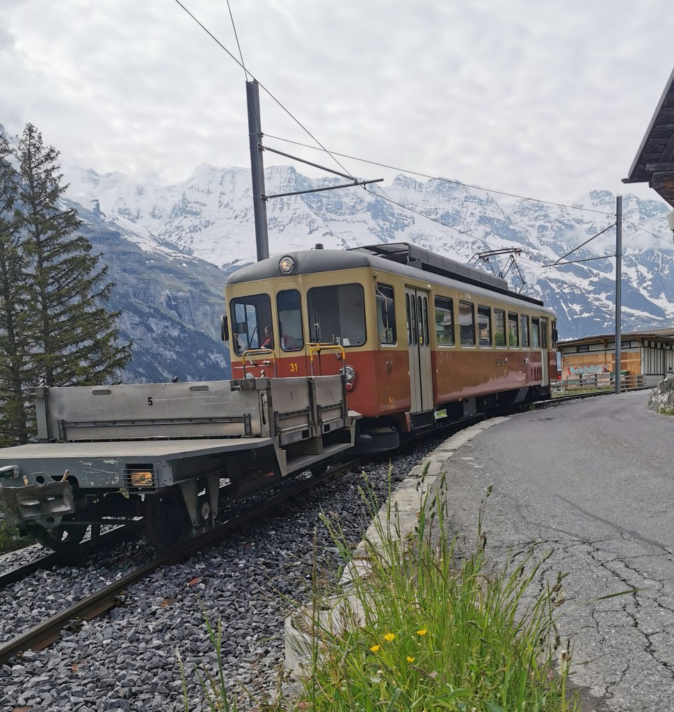 From there we travelled to Kleine Scheidegg, the junction for the railway to Jungfraujoch, the highest station in Europe and the most expensive to reach. We’ve been up there before – it is worth it as a once-in-a-lifetime experience. It had been threatening to rain and we had just settled on the terrace of the station restaurant with beer and bratwurst when it began to rain heavily. We moved to shelter – fortunately it was only a short shower.