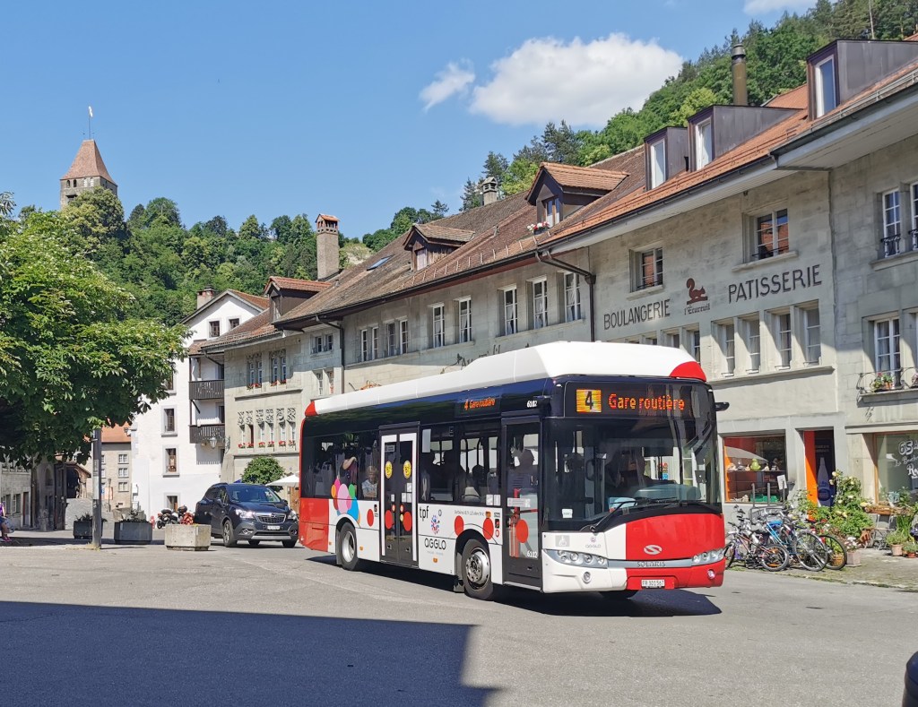 (1) Bulle was the end of the standard gauge line from Romont, where it met the narrow gauge line from Palezieux to Montbovon and its branch to Broc. The Broc line closed in 2021 and has been converted to standard gauge. It reopened in December 2022 as far as Broc-Village. The final section to Broc-Fabrique reopened on 26 August 23, the day when I am writing this page. The station at Bulle has been totally rebuilt and is being formally opened today also. This has allowed Transports Publics Fribourgeois to operate through trains from Bern to Broc via Fribourg, Romont and Bulle, as part of the Bern RER network.