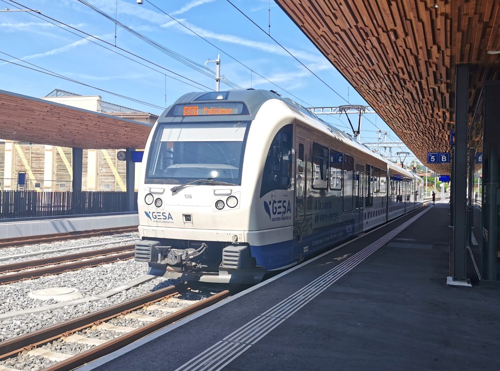 Had things gone according to plan, we would have spent the day travelling to and around the Jura mountains. Time didn’t permit so we decided instead to take a short trip to Yverdon-les-Bains on the Lac de Neuchâtel, through a series of small villages served by a half- hourly train service. Had this been the UK the line would most likely have been closed many years ago.