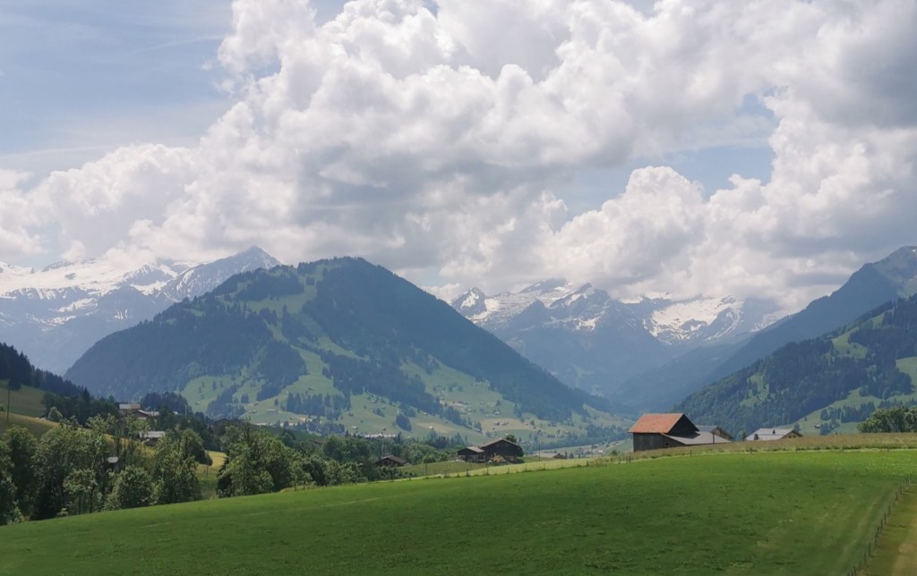 Our next destination was Mürren, a resort in the Bernese Oberland. In order to see some new territory we didn’t travel by the most direct route. The first train of the day took us from Fribourg to Bulle, where there was a connection with the narrow gauge railway to Montbovon (see note 1). Bulle looked attractive but we only had enough time to take a photo of the town with the mountains in the distance.