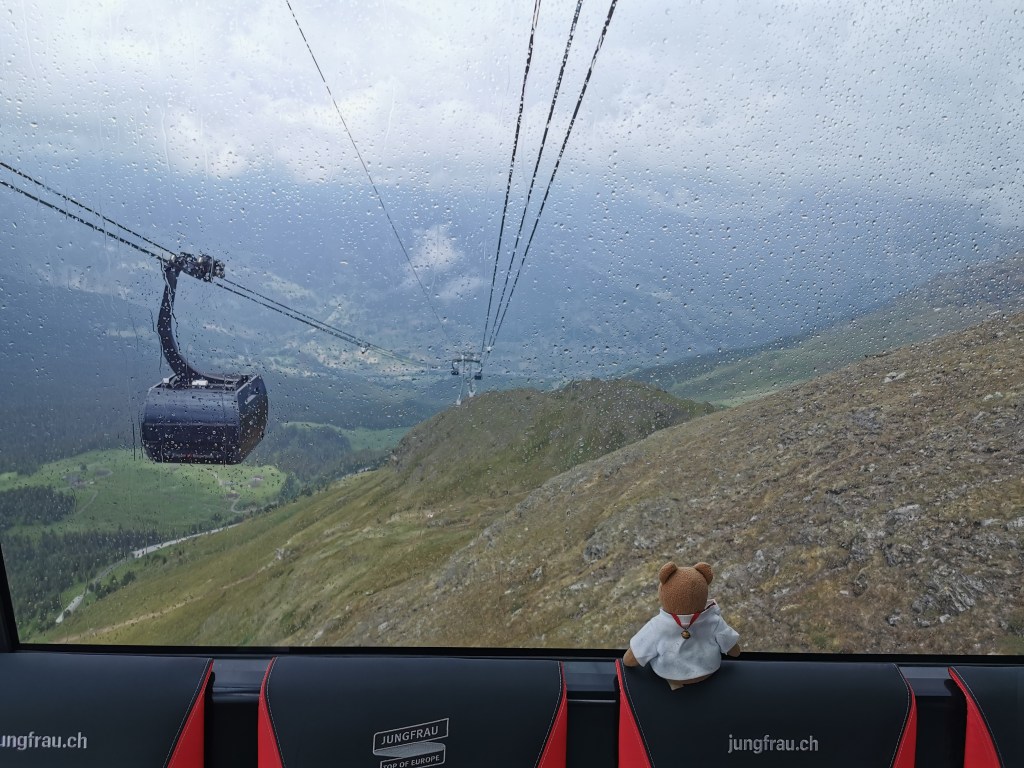 The Eiger Express was built to link Grindelwald and Eigergletcher, relieve overcrowding on the trains and speed up the journey to Jungfraujoch. The cabins take 26 people – the weather had reduced numbers that day and Ted and I were the sole occupants, and we thoroughly enjoyed plummeting downhill to Grindelwald, despite another shower (note 4).