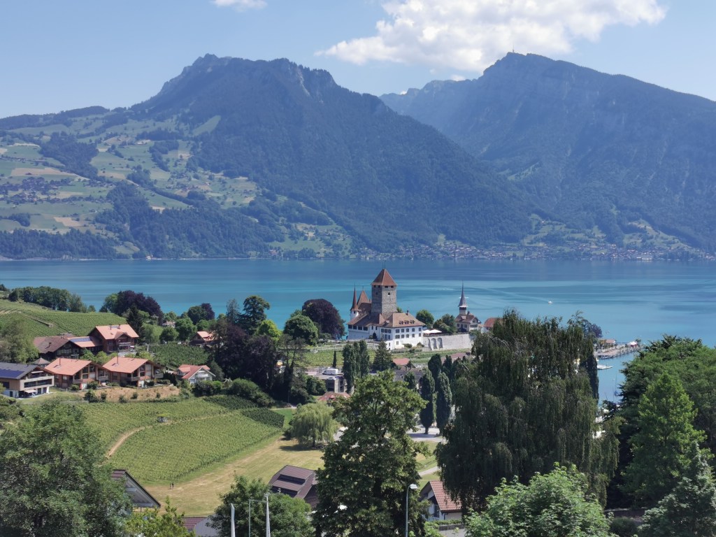 We changed to the Golden Pass line, which runs from Montreux to Interlaken. The stretch from Gstaad via Zweisimmen to Spiez was new to us and lived up to its reputation as a highly scenic route. We sat in a panoramic carriage, where a youngish lad nearby was carrying an alpenhorn. The line climbs by taking a long loop around Gstaad, avoiding the need for a rack and pinion section, then climbs to 1270m over the Saanenmöser Pass, with spectacular views across to snow covered mountains and, finally, down to Zweisimmen where we changed trains from narrow to standard gauge. Golden Pass Expresses can travel through, using a gauge changer. The line then follows the Simmental valley to Spiez on Lake Thun.