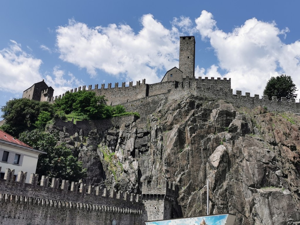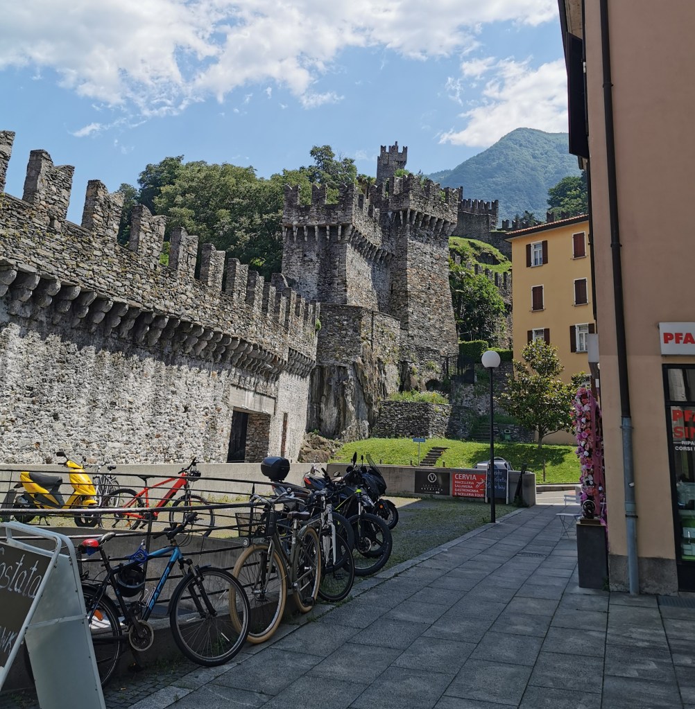 Our destination was Bellinzona, where we had some time to explore. It is a pleasant town which boasts several castles. On a sunny day the pavement cafes were busy and lively. We finished our brief visit with a beer in Birreria Baverese, accompanied by some free pizza. We people-watched – the station platform across the road had a mirrored roof, providing the impression of people walking upside town suspended from the ceiling.