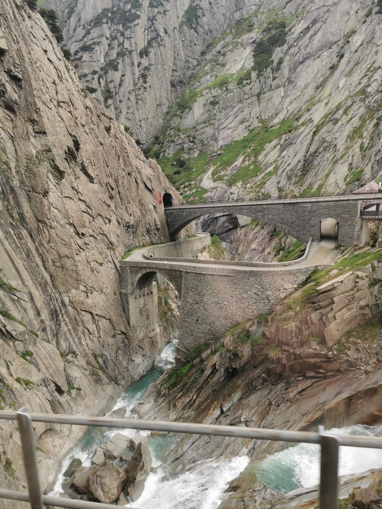 Our day out from Andermatt took us through both the Gotthard rail tunnels. Reading this it feels as though we were collecting tunnels on this trip, but it is difficult to avoid them in the Swiss Alps. The day started by catching the little train that pootles downhill on a rack from Andermatt, past the Devil’s Bridge (pictured), to Göschenen. Göschenen is on the former main Gotthard line from Zurich to Milan. Though it is bypassed by the new Base Tunnel, an hourly train service has been retained on the old scenic route serving local towns and village.