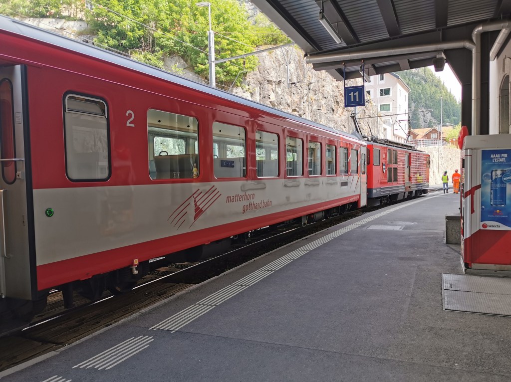 From Visp we followed the route of the Glacier Express through Brig, Fiesch, Oberwald and the Furka Tunnel. We’ve travelled on the Glacier Express many times but this time we travelled on the stopping train. We were lucky to sit in a panoramic car at no extra cost. The Express is purely for tourists but the passengers on this train were locals travelling for a few stations, the occasional tourist, and school parties on end of term trips. There’s more about this route and the towns and railways of the area in the Glacier Express section of Switzerland by Rail.