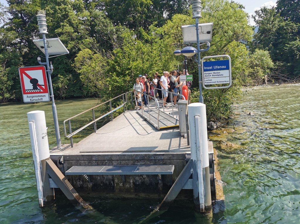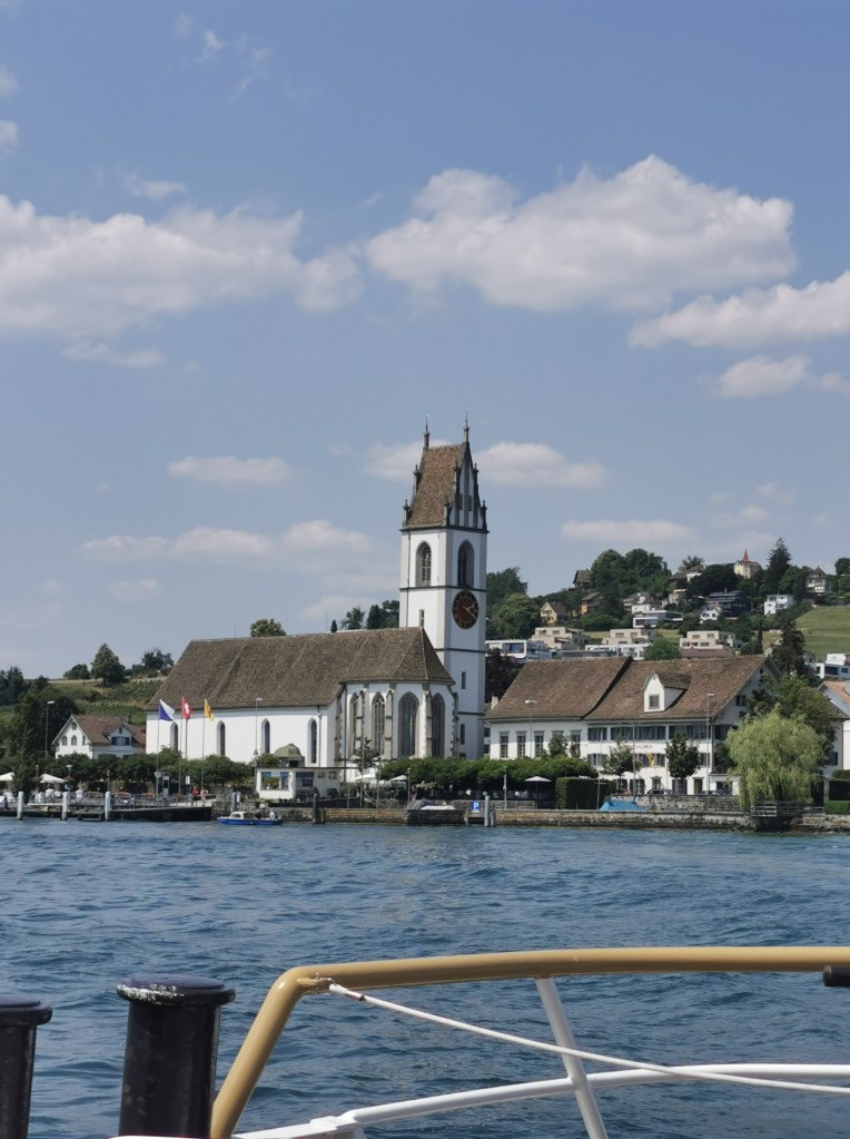 We spent a very relaxing couple of hours on the outside deck of the boat, as we sailed along the length of the Zürichsee to Rapperswil, calling at 8 piers en route. Nearer the city the lakeside is suburban with a lot of very expensive real estate overlooking the lake. Further on are a series of small towns and countryside. The lakeside lidos and recreation areas such as Halbinsel Au and the island of Ufenau were busy with people enjoying a warm Saturday afternoon, and the lake itself was busy with sailing boats.