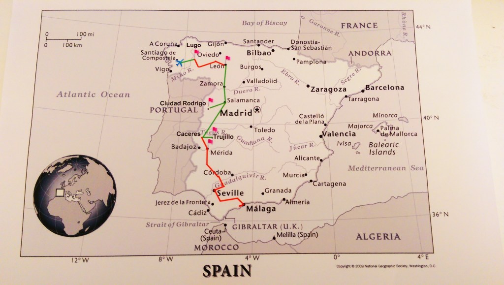It is easy to spend a lot of time doing not a lot on the Costa del Sol. However, there are still quite a few areas of Spain Ted and I haven’t explored. The plan for this trip was to travel from North to South through Western Spain avoiding Madrid – which can be tricky as most rail journeys lead to the capital. This journey took place in March 2016 so hot weather was unlikely to be a problem – when I checked the weather we had just missed some serious winter weather in Galicia.