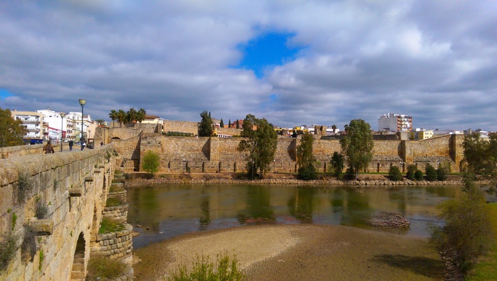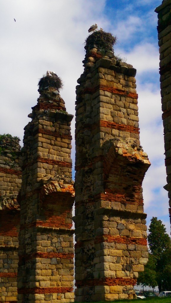 It would take several days to fully explore all the Roman sites so we took in only a few. Close to the station are the remains of a Roman aqueduct (with storks nesting on top of each remaining column). From there we walked down to the wide and shallow Rio Guadiana (which rises near Ciudad Real in central Spain and reaches the Atlantic as the border between Portugal’s Algarve and Spain). From the modern Lusitania Bridge, itself an impressive structure, there are good views of the Roman bridge, sixty arches long. We returned by the Roman bridge, which still forms a main pedestrian route between the two sides of town. Beside the bridge is a Moorish Alcazar, built on the site of a Roman fortress. Nearby, the main square, Plaza de España is a relatively plain affair but it is pleasant, there is space to relax, and we had a beer from a kiosk before finding our hotel.