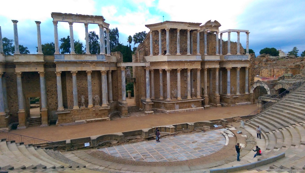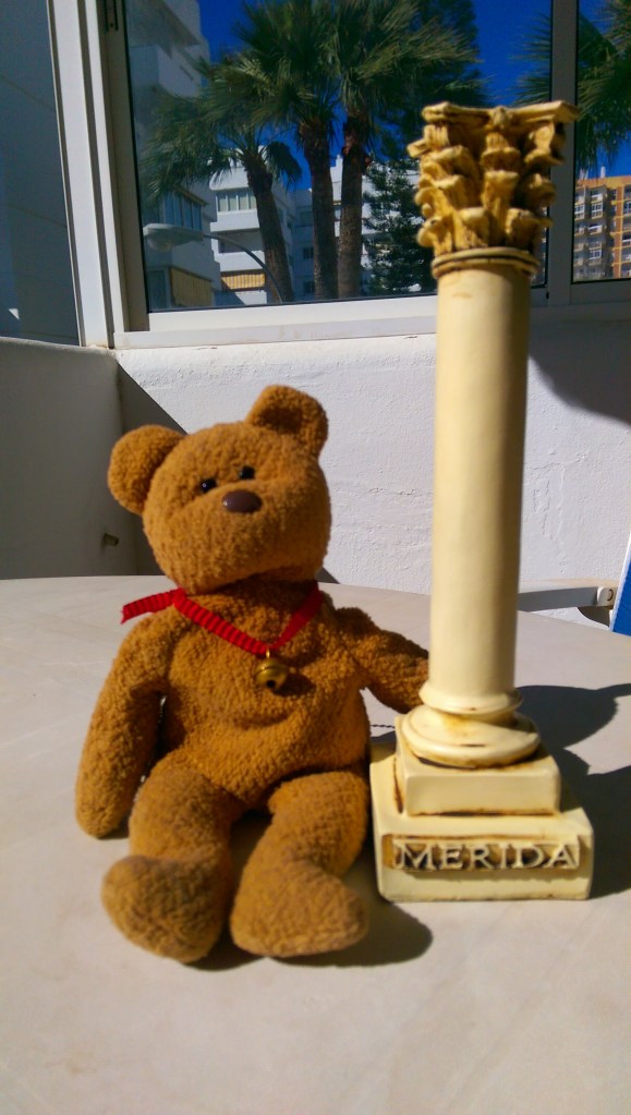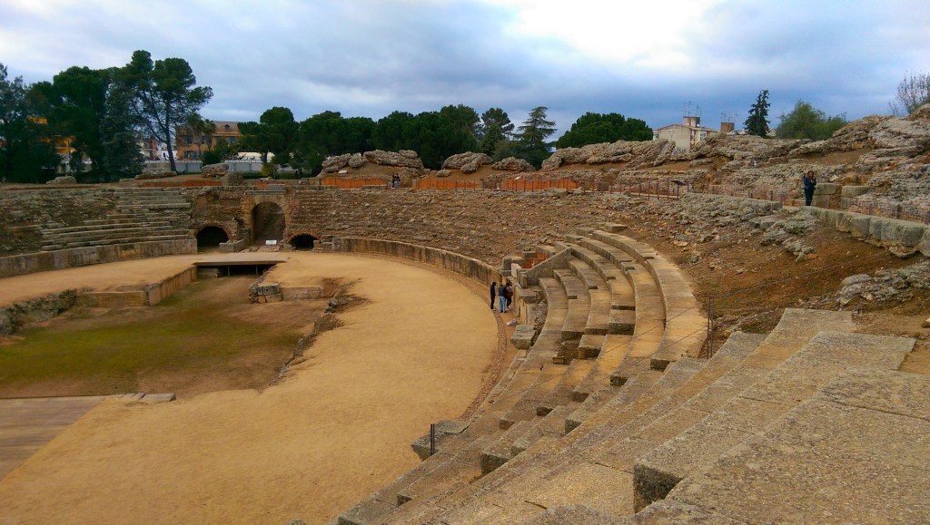 Then we headed to the main Roman sites – the amphitheatre and theatre. It was quiet and there were only about ten of us exploring the large site, though the coach park nearby suggests it is popular during the season. The amphitheatre could hold 15,000 spectators for gladiatorial fights and other events. The theatre is an elaborate affair with two tiers of colonnades, and it is still used in the summer for performances. Near the exit is a row of Roman reproduction shops – Zambrano’s shop has the largest collection of Roman tat imaginable and I bought Ted a Roman column as a souvenir of the trip. Also nearby is the Museo Nacional de Arte Romano, meant to be very impressive, but it was time for food and drink in the row of decent tapas bars across the road and we decided to leave it to the next visit.
