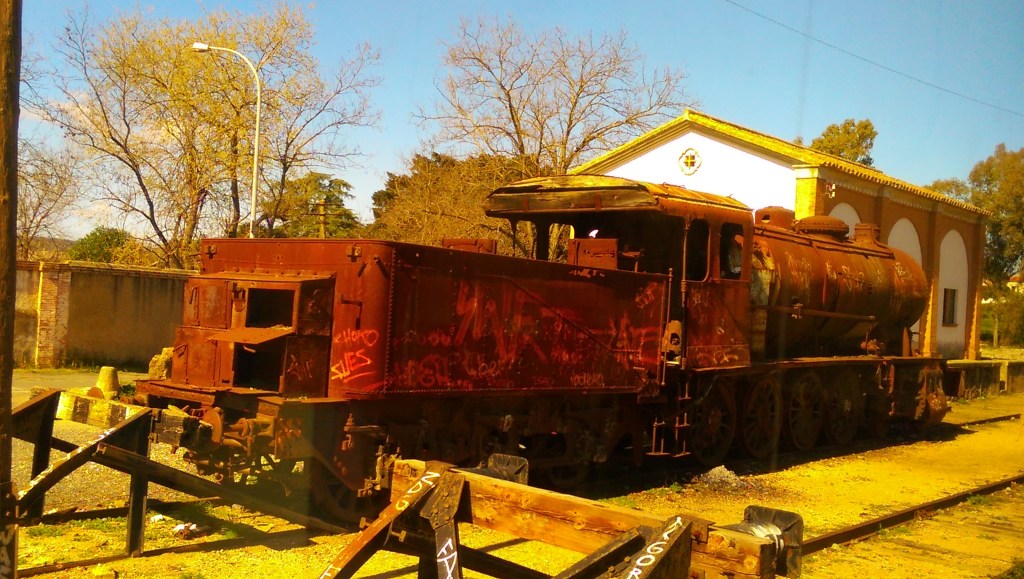 At the foot of the Sierra Morena we are in the valley of the Rio Guadalquivir, the important river which links both Cordoba and Sevilla with the sea. The train calls at Villanueva del Rio y Minas – by now there are five suburban trains a day into Sevilla. The town coame as quite a shock – it was a coal mining and cement making town and the signs of this were everywhere. There was an old steam engine rusting in a siding (pictured below), the mine chimney and headgear still stand, and the town looks as though it has not recovered from the closure of the mines in 1972.