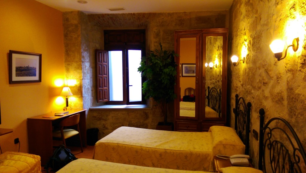 All were good value for money (Ciudad Rodrigo was excellent for the price) even as a single traveller, much cheaper than comparable accommodation in the UK. I used the NH website www.nh-hotels.com and booking.com for the others. I booked room only – there is always a cafe-bar nearby for breakfast, except for Lugo where an (excellent) breakfast was included in the price. All were very central, but with quiet rooms. León, Ciudad Rodrigo and Trujillo were in historic buildings. All of them had free wifi – useful as the internet signal was poor on some stretches. All of the towns except Lugo have parador hotels, all of them in historic buildings, which would be an excellent, albeit more expensive alternative.