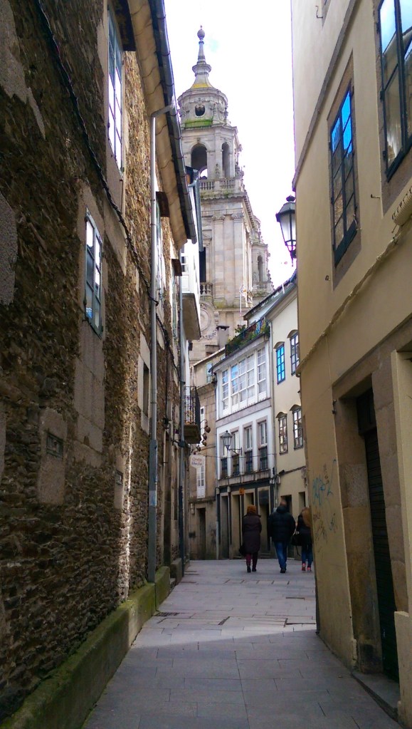 It may have been a clear day but it was also cold – it was only 7ᵒC outside so I hung around the terminal until the bus was due. Lugo is 90 kilometres from the airport, about 1hr 45mins on the bus. We drove through wooded hills on the old national road. An autovía was being built but remains incomplete in 2025. This was a stopping bus, so we passed through the towns and villages en route. Towns such as Arzúa, Melide, Palas de Rei, Guntín are all built on hilltop sites and the housing is typically Galician – blocks of flats with glazed-in balconies and corrugated iron gables. The street signs are in Galego, so there are plenty of ‘x’s in the names. Every village and town has a pulperia or two, specialising in serving octopus.