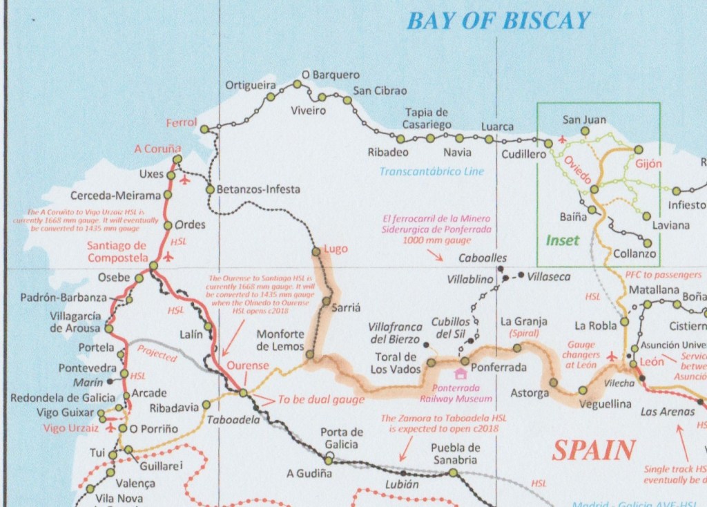 The high speed line between Zamora and Ourense was planned to open in 2018, completing the LAV link between Madrid and Galicia. The section from Madrid reached Zamora in early 2016, trains using a gauge changer to continue on the existing line towards Galicia. The Zamora – Ourence section opened at the end of 2021. From Ourense the line to Santiago de Compostela, A Coruna and Vigo was already open.