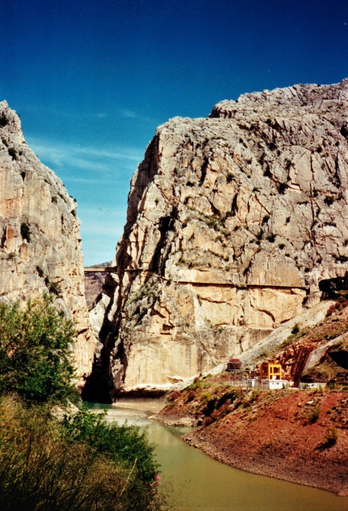Bobadilla, where lines from Málaga, Algeciras, Sevilla, Madrid and Granada meet, has lost much of its role as the Crewe Junction of Andalucía since the Madrid – Málaga high speed line was opened and much of the traffic now calls at the nearby Antequera-Santa Ana. station. Between Bobadilla and Málaga the railway had to find a route through the mountains. After the longest tunnels there are a series of short tunnels between which there are spectacular views of the El Chorro gorge, and the Caminito del Rey, the walking route along the sheer side of the gorge. Unused for many years the path has been repaired and reopened and people wave to the train from the path. This stretch of line makes it well worthwhile to take this route rather than the faster high speed trains between Sevilla and Málaga – it also gives a view of the impressive viaduct on the new line near Alora.