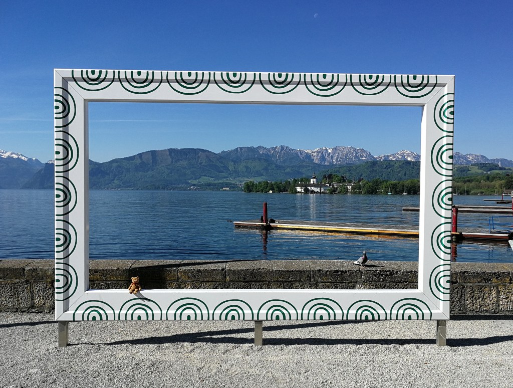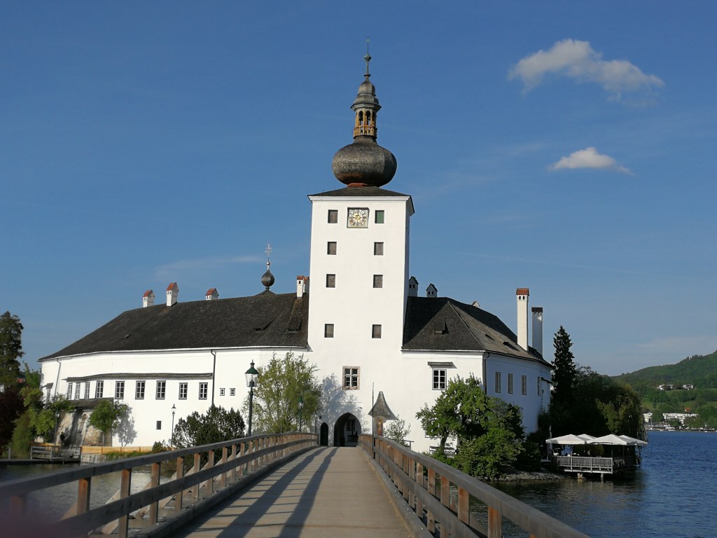 Later, we tear ourselves away from the balcony and the view and walk along the lakeside past the outdoor cafes to the castle, built on the lake and connected to land by a wooden bridge. This is Seeschloss Ort (Landschloss Ort is on dry land nearby) and there has been a castle on the site since the 11th century. On our return we walk around the old town. There is not a lot happening here at the beginning of the week – though it looks like a few café-bars and pubs will be open towards the weekend. Apart from a small supermarket and some gift shops there is not much else – there are a few former shops, and later I discover there is an out of town shopping centre. We have a meal and a couple of beers in town then watch the sunset from the balcony.