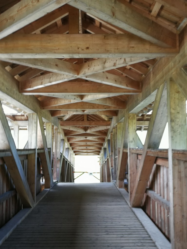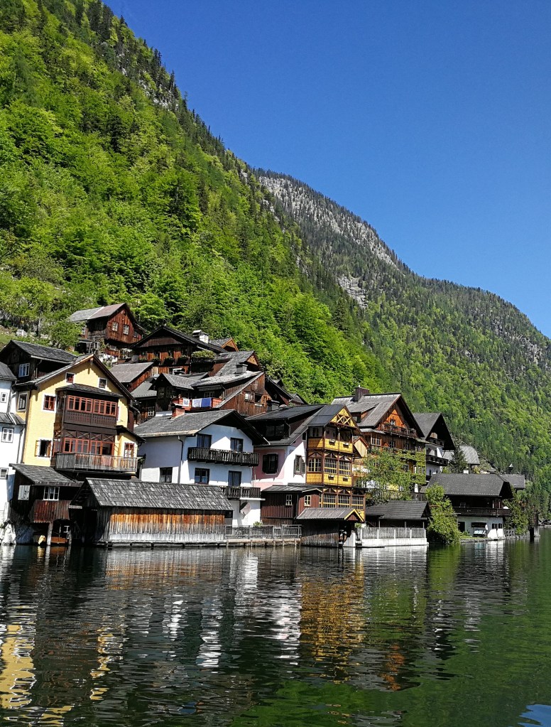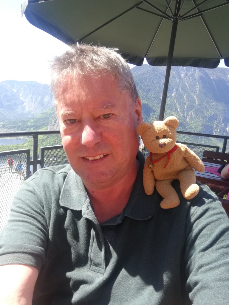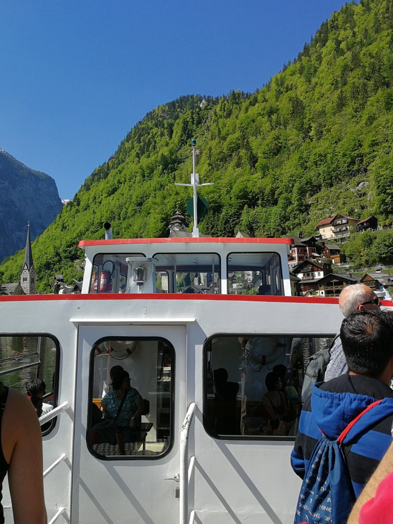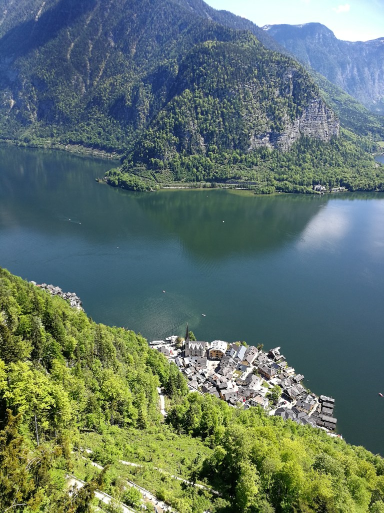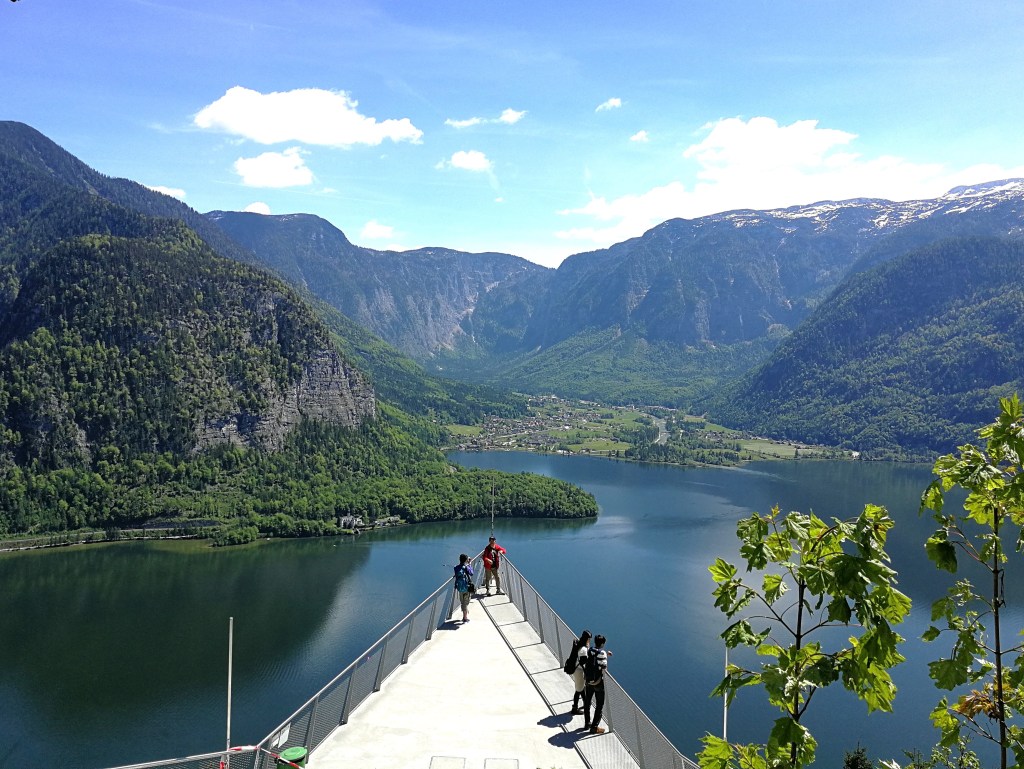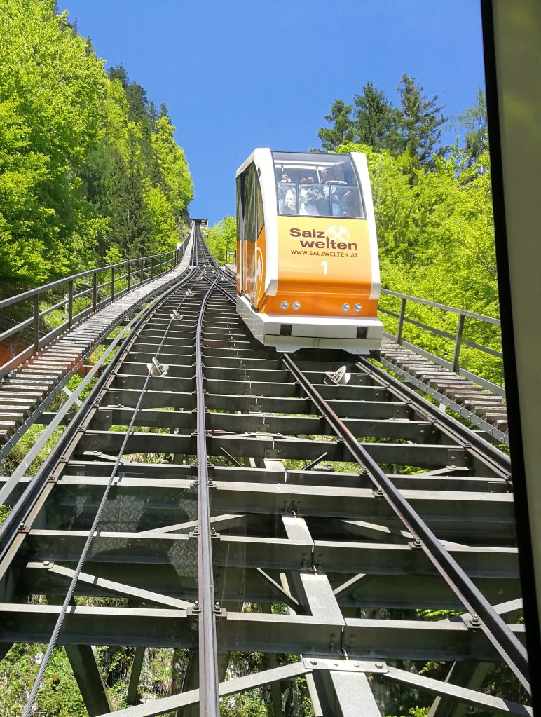 We take the Salzbergbahn funicular up to the salt works. In a distance of 0.5km the line rises 325m, reaching a gradient of 81.5%. The tour through the mine looks like fun but I decide to be boring and stick to the view. At the top of the funicular is the Rudolfturm restaurant and viewpoint, branded as a World Heritage View. A skywalk platform has been built, jutting out over the lake, and I take some photos of Ted while trying not to shake. The view from the restaurant terrace is just as good, so we relax and enjoy the view over a bratwurst and a beer.