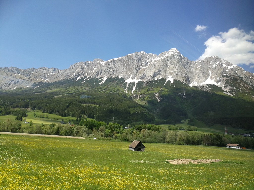I had booked a cheap advance first class ticket from Salzburg to Graz, a four-hour intercity journey which operates five times daily. The timings meant I didn’t have a chance to look round Salzburg (I last stayed there in 1972 on my first independent trip abroad and we got round to visiting again in 2018, see Bergamo, Innsbruck and Salzburg), but the journey made up for it. From Salzburg the line passes through a gorge of the River Salzach to Bischofshofen. We leave the Westbahn and climb up over a low pass, to the valley of the River Enns and the ski resort of Schladming. There are good views to the mountains at the southern end of the Salzkammergut.