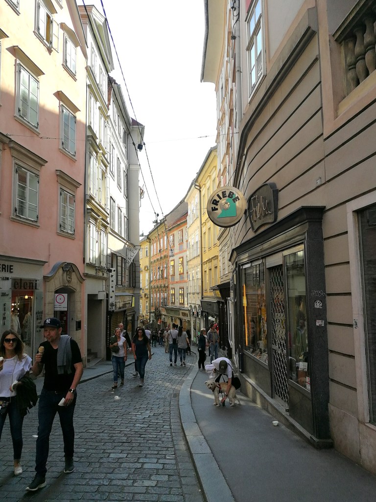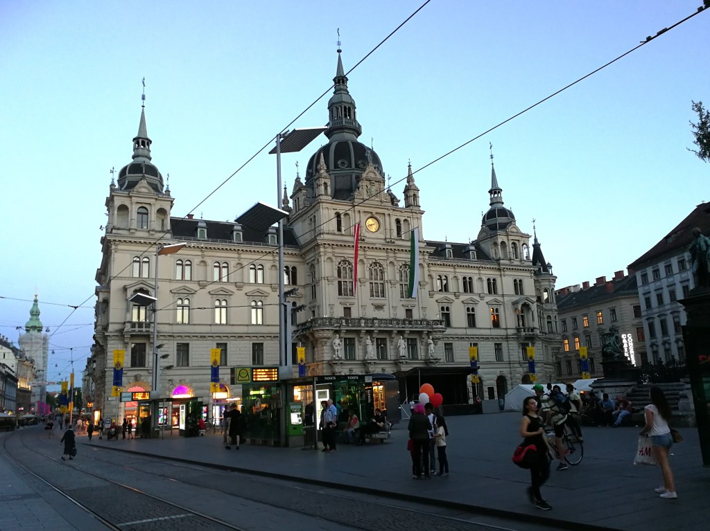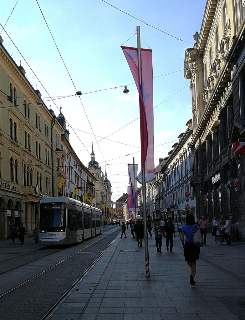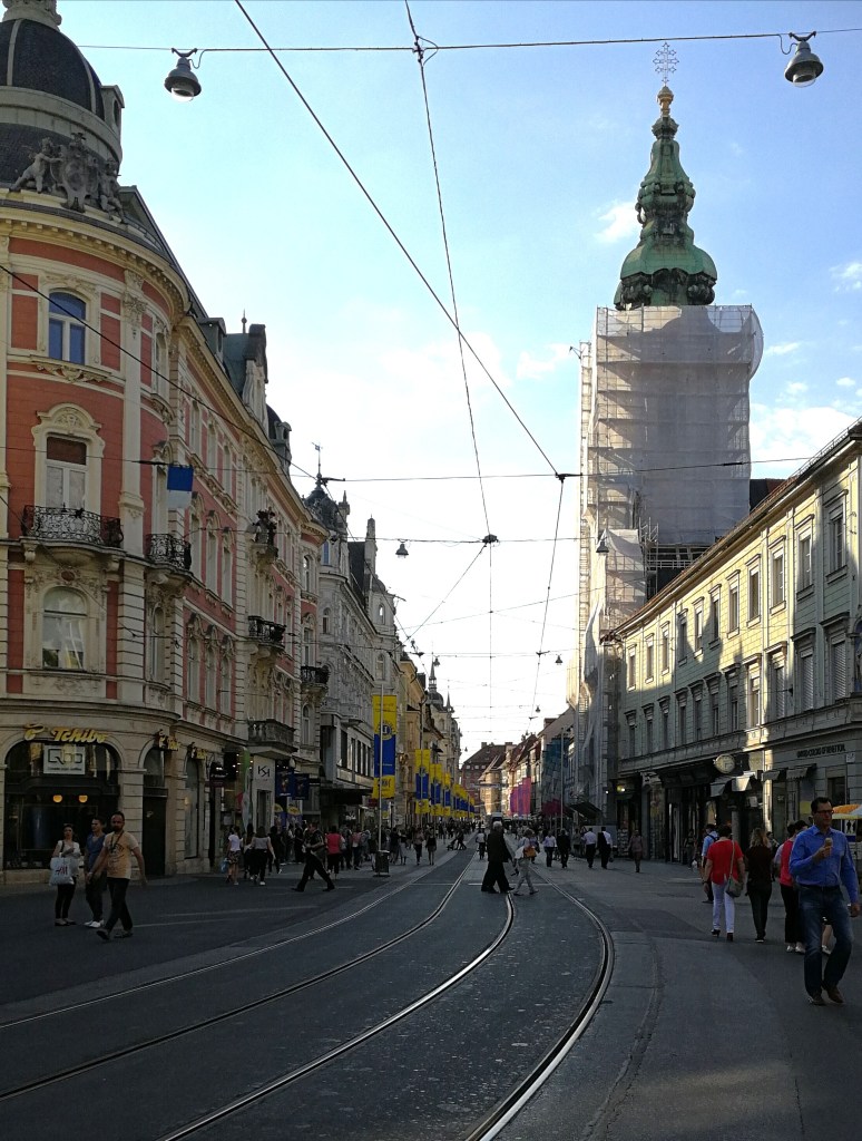 We catch a tram into the centre of Graz and wander round a bit, from the main tram interchange at Jakominiplatz along the main shopping street, Herrengasse, to the Hauptplatz and town hall, then into the old town. There is more detail about the tram network in Railway Buffery 7. The city centre is busy at teatime on Friday and it’s a handsome place. The Hauptplatz has a dozen foodstalls in it, and we have the choice of four würstelstände for dinner. Most cafe and bar terraces are packed and we have a drink inside an ‘Irish’ bar in the old town, because it’s quiet. There are several people smoking inside despite food being served – In Linz and Gmunden any smoking was confined to a separately ventilated room. The barman tells me the law is going to be strengthened and enforced in 2018. I find a local pub in a back street for a couple more, then it is currywurst time. At 2030 the stalls are closing so the nightlife must be elsewhere. I discover one stall which sells a huge variety of sweeties for kids from one window and a huge variety of bottled beer from the window on the other side – ideal for a family night out. However, we forgo further delights and have an early night.