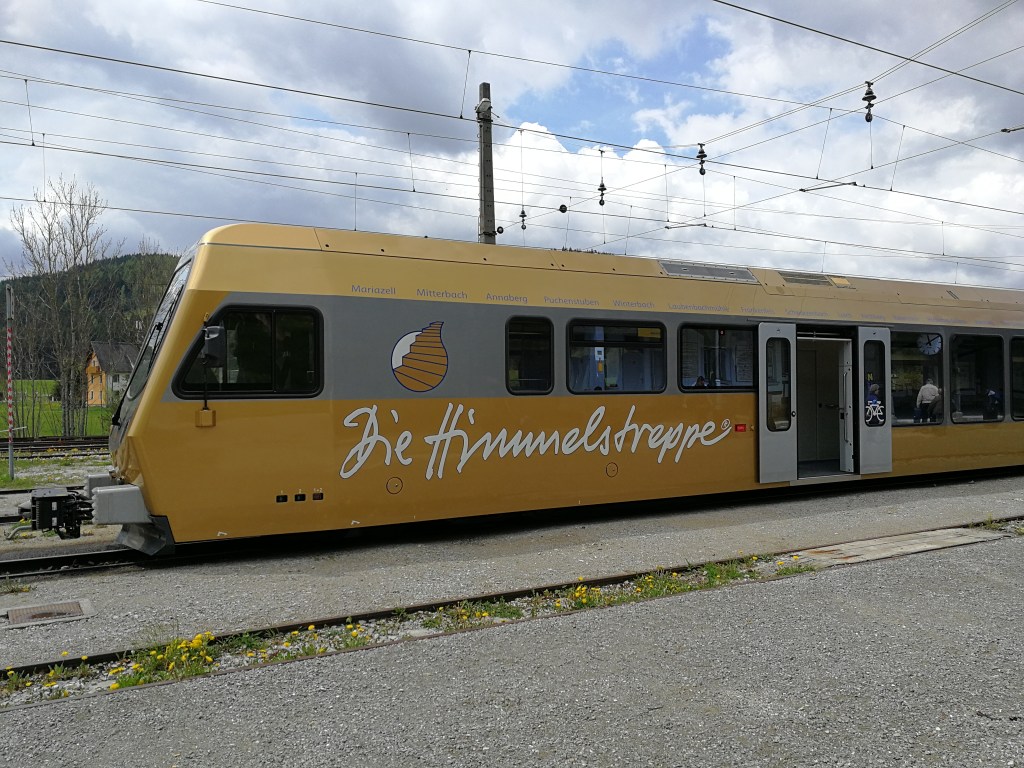 The following day we head for the Mariazellerbahn – a narrow gauge railway line leading from St. Polten, on the route to Vienna, up into the hills to the winter sports resort and pilgrimage centre of Mariazell. After breakfast we walk to Linz station, sort myself out with a Vorteilscard for cheap travel (the equivalent of the UK wrinkly railcard – as elsewhere small bears travel free), and catch an ÖBB (Österreichische Bundesbahnen – Austrian Federal Railways) Railjet mainline express to St. Polten. It is more than ten minutes late – ÖBB is blaming engineering work in Germany. I have to dash for the Mariazellerbahn but the train waits. It is a modern electric two-coach train, marketed as the himmelstrecken (stairway to heaven – but without the music).