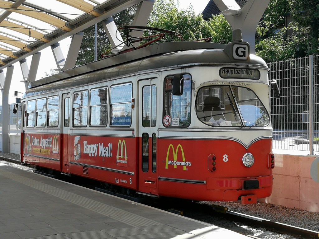 The following morning we’re off to Hallstatt. Gmunden ÖBB railway station is uphill on the edge of town and to reach it there is a tramway. Every half hour the tram pootles up to the station, causing chaos on the way as it heads up a narrow one-way street in the wrong direction. The tramway is also operated by Stern & Hafferl, but has never been linked to their railway line on the other side of bridge – when we visited this was planned to happen in 2018, and it was completed on time.. A modern tram operates most journeys while Tram No.8, built in 1961, copes with the quieter journeys and rush hour extras (we made six journeys and none of them had as many as ten passengers). Tram No.8 has an all-over McDonalds ad, though it doesn’t pass one….maybe it is in the out of town centre. You pay the driver, and once more he knows most of the regular customers. For more details and an update on the tramway see Railway Buffery 5.
