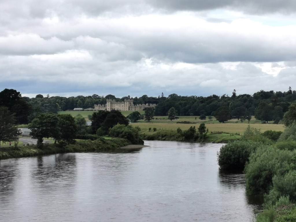We travelled onward to Kelso and checked into the Queens Head Hotel – a little expensive but we had a large, comfortable room and a good breakfast. We had a walk round the town centre and the pleasant central square (known as The Square). We looked at the ruined Abbey (closed to punters because it is collapsing – not surprising after that length of time). Beyond the Abbey we continued down Bridge Street to Kelso Bridge (they are inventive with names around here), with views over the Tweed Valley to Floors Castle. Back in town we noticed plenty of good quality independent shops and fewer of the large chains.