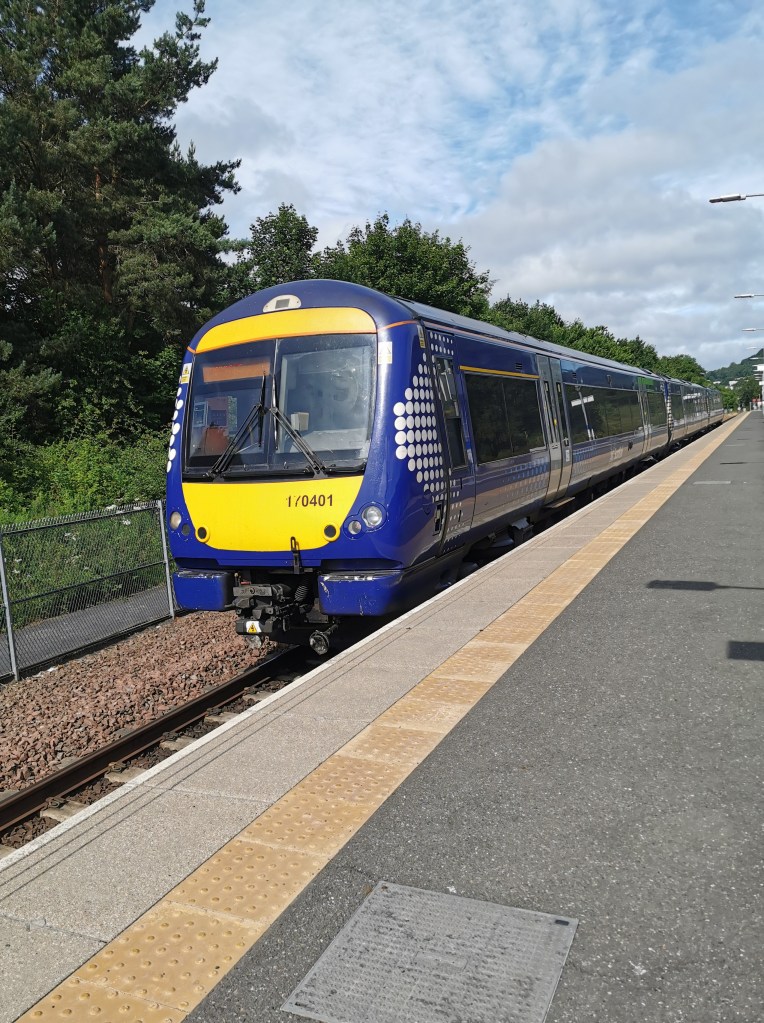 Our friend Ken joined Ted and I on our second visit, this time meeting up at Edinburgh Waverley to catch the Borders Railway train to Galashiels. The line was reopened in 2015 and it was good to observe that the train was busy. There’s not much to see on the outskirts of Edinburgh but, as we travelled through the Moorfoot Hills the views were better.