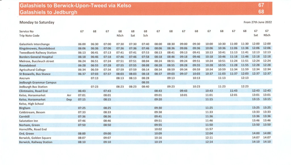 The key bus services are Borders Buses 67 and 68. Details are at www.bordersbuses.co.uk and on the Borders Buses app. Jointly they run every 30 minutes (hourly Sundays) between Galashiels, Tweedbank, Melrose and St Boswells until about 2000, Beyond St. Boswells, the 67 continues hourly (every two hours on Sunday) to Kelso where a change of bus connects to Coldstream, Norham and Berwick every two hours. (limited Sunday service). The 68 continues hourly (every two hours Sundays) to Jedburgh via Ancrum. Full timetables are on the website.