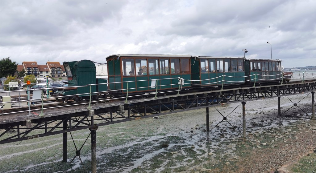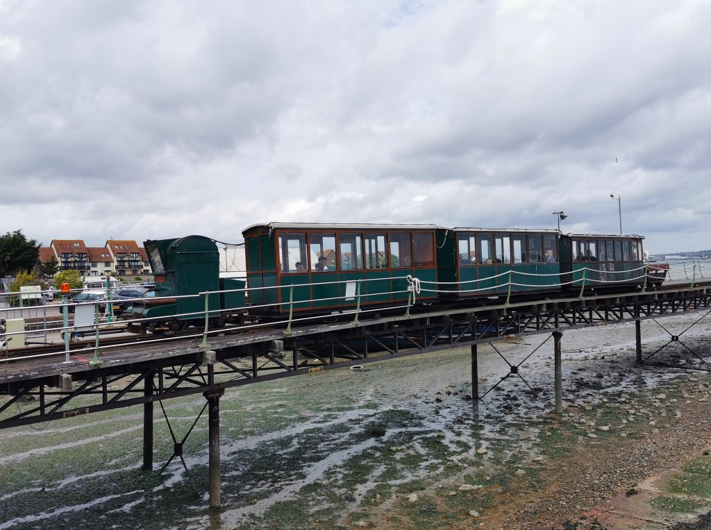 A day out from Winchester took us to Hythe on Southampton Water for a ride on the Southampton to Hythe Ferry and the Hythe Pier Railway. The ferry runs hourly from Southampton’s Town Quay and on our visit they were using the small reserve boat. It is mainly used by people from Hythe – it is quicker than travelling by car or bus into Southampton. It has been under threat of closure but shortly after our visit it was bought by Red Tunnel Ferries and its future seems secure. After ten minutes, we arrived at the crumbling Hythe Pier.