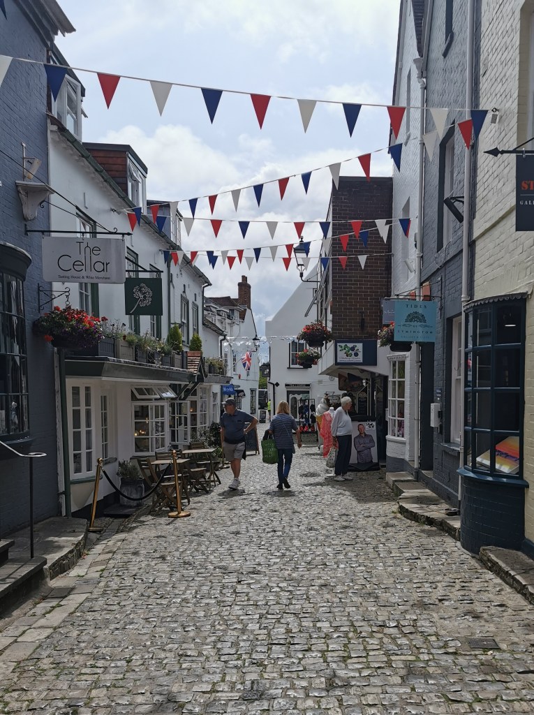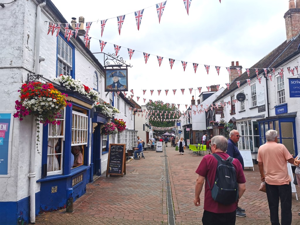 In Hythe the weather was good, it was market day and the town was busy. We sat in the beer garden of the Lord Nelson and watched the pier train rumble by.